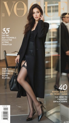 A stylish and modern female model in Magazine cover,wearing model clothes, black garter stockings,high heels,model pose.,plns,jag
