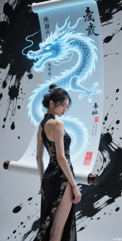 The image depicts a woman standing in front of a scroll that features a large, glowing blue dragon. The scroll is adorned with Chinese characters and red stamps. The woman is dressed in a black, elegant dress with a high slit, and her hair is styled in a traditional updo. The background consists of a black and white abstract pattern with splashes of ink, creating a dynamic and artistic atmosphere. The dragon on the scroll is intricately detailed, with its scales shimmering and its eyes glowing with an ethereal light. The overall composition blends traditional elements with a modern, fantastical twist.