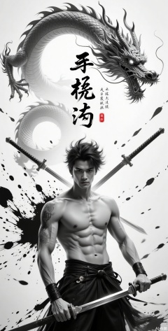 solo, short hair, 1boy, holding, monochrome, weapon, greyscale, male focus, sword, holding weapon, muscular, holding sword, abs, katana, spot color, topless male, dragon, chinese text, eastern dragon