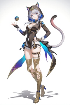 8k,best quality,masterpiece,(ultra-detailed),(high detailed skin),((artist:reoen), (artist:torino_aqua),year 2024:0.8)1girl,[artist:wlop],[artist:ningen_mame],artist:ciloranko,[[artist:rhasta]],artist:tidsean,artist:iumu,full body,full shot,standing,looking at viewer,(solo:1.2),simple background,(white background:1.2),hand on own hip,(white background:1.1),<lora:Cipher-ill-Tanger-000012:0.8>,Cipher \(honkai: star rail\),cat girl,cat ears,cat tail,clothes: Cipher black clothes,1girl,blue eyes,breasts,fingerless gloves,thighhighs,boots,