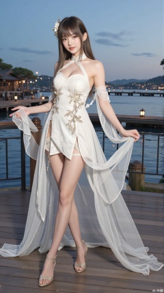 1girl, white wedding dress,looking at viewer, mischevious smile, perfect body, scenery, sharp focus, best quality, masterpiece, detailed outfit, illustration, perfect eyes, finely detailed beautiful anime eyes, realistic skin, intricate details, best lighting, depth of field, ultra high resolution, cowboy_shot, bride