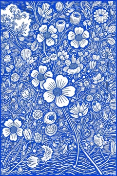 lino print, , center of image, waves, sketches, arts and crafts, many flowers, monochrome, white and blue, detailed texture, blue background, flat, complex details,