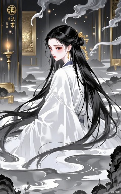 LJCH, Chinese ink - style digital illustration of a lonely ghostly beauty with long, translucent black hair, wearing a tattered white hanfu. She is floating in a desolate ancient tomb, with flickering torches on the walls. The background is a dark and eerie space with a faint golden glow from an unknown source. Her expression is sad and forlorn, as if she is trapped in a world of memories. The illustration has a haunting and melancholic quality, with pale ink washes and gold outlines for the tomb details.