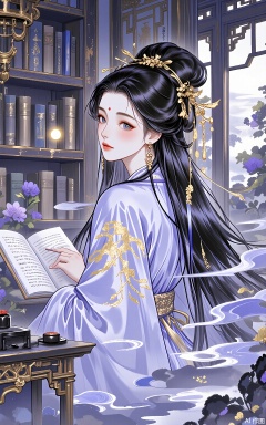 LJCH, Chinese ink - style digital illustration of a dreamy poetess with long, loose black hair, wearing a lavender silk robe with gold embroidery of clouds. She is sitting by a window, looking out at a moonlit garden. The background is a soft - lit room with bookshelves filled with ancient scrolls and a desk with an inkstone and brush. Her expression is thoughtful and inspired, as if she is about to write a beautiful poem. The art has a romantic and intellectual atmosphere, with light ink washes and gold accents for the cloud embroidery.