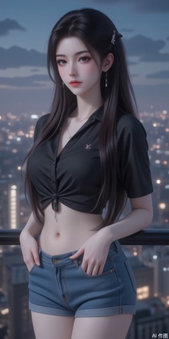 1girl, long hair, masterpiece, best quality, 3dmm style, lifelike, high quality, 3D realistic works, ultra-high details, 8k, real skin material, real blood vessels under the skin.High quality, masterpiece, 8K ultra-clear,1girl,black hair,longeyelashes,eyeshadow,very long hair, SFW, Best quality, masterpiece, 8k, 1 girl, solo, long hair, chest, exquisite hair accessories, looking at the audience, black hair, shirt, black hair, buttons, jewelry, standing, full body, short sleeved, outdoor, sky, shorts, abdomen, high heels, bracelet, crop top, legs, black shirt, shorts, bare legs, night, blue denim pants, denim shorts, standing at the highest point of the city overlooking the bustling urban night view,There is a heart-shaped tattoo on my belly,yuanyao
