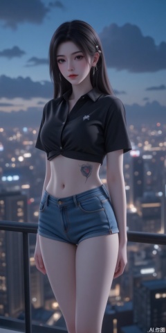 1girl, long hair, masterpiece, best quality, 3dmm style, lifelike, high quality, 3D realistic works, ultra-high details, 8k, real skin material, real blood vessels under the skin.High quality, masterpiece, 8K ultra-clear,1girl,black hair,longeyelashes,eyeshadow,very long hair, SFW, Best quality, masterpiece, 8k, 1 girl, solo, long hair, chest, exquisite hair accessories, looking at the audience, black hair, shirt, black hair, buttons, jewelry, standing, full body, short sleeved, outdoor, sky, shorts, abdomen, high heels, bracelet, crop top, legs, black shirt, shorts, bare legs, night, blue denim pants, denim shorts, standing at the highest point of the city overlooking the bustling urban night view,There is a heart-shaped tattoo on my belly,yuanyao