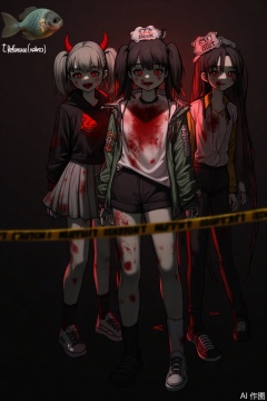 The image depicts three stylized characters standing in front of a dark background. They are dressed in a mix of casual and edgy clothing, with noticeable blood-like stains on their clothes and skin. The character on the left has short gray hair tied into pigtails with red devil horns, wearing a black hoodie with a red symbol on the chest and a skirt. The middle character has long black hair and is wearing a white shirt with a large red symbol on the chest, a green jacket, and black shorts. The character on the right has long black hair and is wearing a white shirt with a yellow collar, black pants, and black boots. They are all standing behind a yellow caution tape that reads "KEEP OUT." The character on the left has a small fish-shaped object with a red symbol on its side, and the middle character has a white and red symbol on their headband. The overall scene has a dark and eerie atmosphere, with red lighting enhancing the dramatic effect.,dcpzst