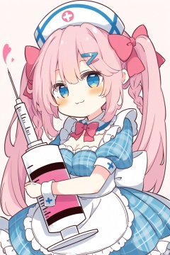 1girl, solo, dress, braid, bow, breasts, cleavage, pink_hair, hat, hair_ornament, oversized_object, long_hair, nurse_cap, :3, blush, twin_braids, blue_eyes, hairclip, blue_dress, puffy_sleeves, holding, hair_bow, food, short_sleeves, white_apron, looking_at_viewer, puffy_short_sleeves, smile, closed_mouth, medium_breasts, frills, apron, syringe, wrist_cuffs, twintails, very_long_hair, frilled_dress, pink_bow, plaid, hugging_object, detached_collar, sidelocks