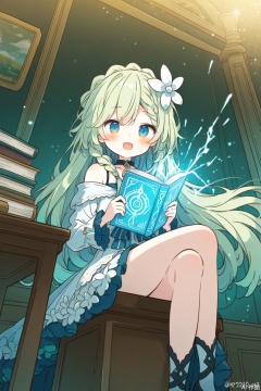 1girl, book, solo, open_book, holding, dress, blue_eyes, smile, long_hair, :d, off_shoulder, cup, hair_flower, holding_book, sitting, hair_ornament, off-shoulder_dress, blush, flower, bare_shoulders, white_dress, indoors, very_long_hair, braid, looking_at_viewer, white_flower, long_sleeves, black_footwear, dutch_angle, book_stack, mug, twitter_username, green_hair, green_theme, blue_dress