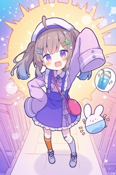 1girl, orange_socks, solo, hair_ornament, food-themed_hair_ornament, skirt, bag, suspenders, socks, bandaid, brown_hair, sleeves_past_wrists, frills, long_sleeves, long_hair, bandaid_on_leg, smile, purple_skirt, full_body, open_mouth, suspender_skirt, asymmetrical_legwear, shoes, standing, arm_up, hat, drinking_straw, white_footwear, hairclip, rabbit, :d, frilled_skirt, looking_at_viewer, purple_eyes, bandaid_on_knee, rabbit_hair_ornament, cup, hand_on_own_hip, twintails, speech_bubble, blush, sweater, sleeves_past_fingers
