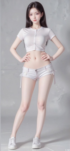 masterpiece,best quality,Realism,The real background,,1girl,long hair,Super short white shirt,Ultra short jeans,hands on hips,bs,ass