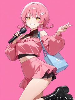 1girl, yellow eyes, twin braids, solo, cheerful grin, flower hairpin, short hair, tote bag, direct gaze, ring, off-shoulder top, parted lips, musical note earrings, holding microphone, Chinese characters, pastel pink background, mini skirt, platform boots