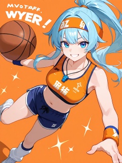 1girl, bright blue eyes, high ponytail with sweatband, solo, energetic grin, headband with star motif, long hair, gym bag, focused gaze, silicone wristbands, sports bra and shorts, open mouth, whistle necklace, holding basketball, motivational quotes, vibrant orange background, leg warmers, sneakers
