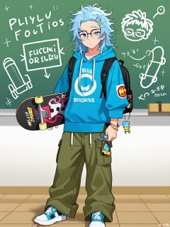 1boy (adjusted for gender), sky blue eyes, messy spiky hair with pencil clip, solo, mischievous wink, glasses on forehead, medium hair, backpack with patches, playful look, friendship bracelet, hoodie and cargo pants, pouting lips, keychain charm, holding skateboard, doodles and equations, light green chalkboard background, sneakers