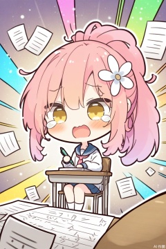 1girl, solo,long hair, open mouth, long sleeves, school uniform, closed eyes, serafuku, tears, crying, > <, pink hair,yellow eyes,ponytail,blush,wavy mouth,hair flower,White flower,chibi,school desk, school chair,sitting, holding pen, paper,writing,