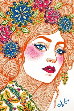 1girl,extremely detailed,beautiful face, masterpiece,top quality,best quality,official art,beautiful and aesthetic,colorful,flowers,highest detailed,shiny skin,many colors,feathers, rprint,vibrant colored watercolor drawing with ink sketch lines, lino,Reduction linocut