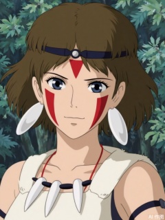 1girl, solo, looking at viewer, short hair, blue eyes, brown hair, jewelry, earrings, necklace, headband, facial mark, facepaint,Hayao Miyazaki style