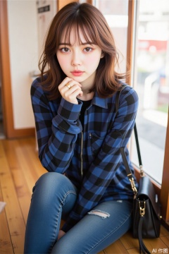 1girl, solo, long hair, looking at viewer, smile, brown hair, shirt, long sleeves, brown eyes, jewelry, sitting, full body, parted lips, pants, indoors, medium hair, bag, lips, head tilt, plaid, blue shirt, denim, jeans, wooden floor, plaid shirt, fashion