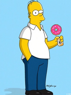 A digital drawing of Homer Simpson in side profile. He has yellow skin, a square head with three spiky hair tufts, and a neutral expression. Wears a white collared shirt (untucked), blue pants, and black dress shoes. Holds a pink frosted donut in one hand and a "Duff Beer" can in the other. Background: Light blue. Signed "Matt Groening" in the bottom right corner.