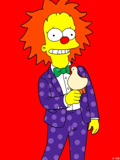 A digital drawing of Krusty the Clown in side profile. Yellow skin, wild red hair, and a red nose. Wears a purple polka-dot suit, a green bowtie, and red-and-white clown shoes. Holds a rubber chicken prop with a toothy grin. Background: Bright red. Signed "Matt Groening" in the bottom right corner.