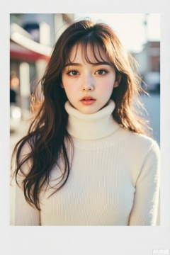 1girl, solo, long hair, looking at viewer, brown hair, brown eyes, upper body, outdoors, parted lips, blurry, sweater, lips, head tilt, blurry background, turtleneck, turtleneck sweater, realistic, white sweater