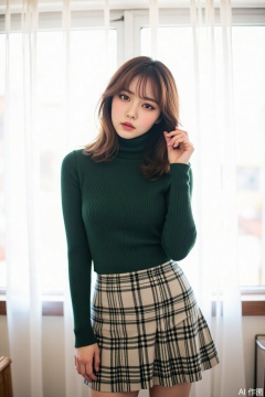 1girl, solo, long hair, looking at viewer, skirt, brown hair, long sleeves, brown eyes, standing, cowboy shot, indoors, sweater, lips, head tilt, plaid, window, plaid skirt, curtains, realistic, green shirt, green sweater