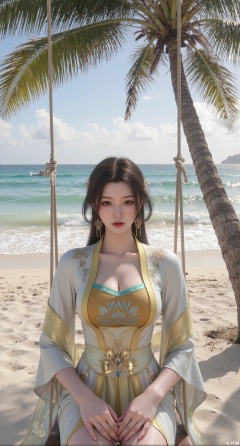 SFW,(masterpiece:1.2),best quality,absurdres,masterpiece,original,extremely detailed wallpaper,perfect lighting,Golden sandy beach covered with vibrant flowers, turquoise waves gently lapping the shore, elegant woman in embroidered qipao swinging on a wooden swing under coconut trees, bright flower clusters spreading from sand to palm tree roots, soft natural light filtering through coconut leaves, ocean breeze lifting hair and qipao hem, high-resolution details showcasing petal textures and silk fabric sheen, ultra-wide angle lens capturing coastline panorama, cinematic color grading with soft focus on the central figure,(huge breasts:2.99),(full breasts:2.99),Xanmiaoyi,Xyunwangshu,XlishaoyinY,Xbaixue,XanmiaoyiY,Xxiuqiuhua,XbaiyuerongY,XyunyunX,XqingnvzongZM,Xjuzi,Xshangguanweier,XanmiaoyiXY