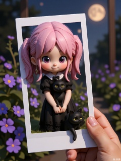 PLD: A digital illustration of a teenage girl with long pink hair in pigtails, wearing a gothic Lolita dress with lace trim. She holds a polaroid of a black cat, tilting her head innocently. Background: Moonlit garden with glowing purple flowers. The polaroid frame is held by a hand in the foreground.