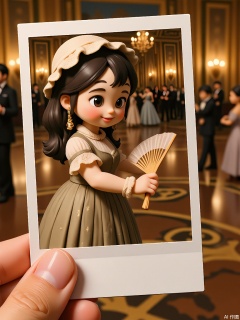 A historical fiction illustration of a Victorian girl with a bonnet and a lace dress, holding a polaroid of a grand ballroom. She clutches a fan and blushes shyly, with chandeliers casting a warm glow over marble floors. The background features opulent architecture and couples waltzing in the distance. The polaroid frame is held by a hand in the foreground.