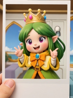 PLD, A fairytale-inspired painting of a princess with golden curls and a flowing gown, holding a polaroid of a cursed castle. She holds a lantern and looks brave, with thorny vines crawling up the castle walls. The scene is set at twilight, with a full moon casting an eerie glow over the landscape. The polaroid frame is held by a hand in the foreground.