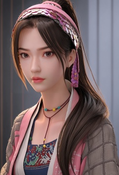 score_9,high detail,best quality,cinematic lighting,volumetric lighting,shiny skin,shiny,1girl,necklace,solo,jewelry,long hair,looking at viewer,black hair,lips,realistic,brown eyes,ponytail,collarbone,hairband,brown hair,simple_background,upper_body,thighs,cowboy_shot,<lora:QQSponytuliV1:0.8>,<lora:Pony_DetailV2.0:0.8>,<lora:皮肤凹痕:0.1>,