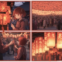 The image is a series of panels depicting a scene of a young girl, with short red hair, participating in a traditional lantern festival. The panels show her interacting with red lanterns, writing on one, and setting up another. The background features a crowd of people dressed in traditional attire, standing in a dimly lit area, possibly a street or a temple. The lanterns are illuminated, casting a warm glow, and the atmosphere is festive. The girl appears focused and engaged in the activity, suggesting a sense of cultural or historical significance.The girl tied the rope to the lantern, and then she lowered her head