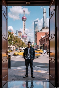 As the door opens, a male model stands on the street. Modern buildings like the Oriental Pearl Tower complement the street scene, with vehicles and pedestrians coming and going, interweaving Shanghai's vitality and modern flavor..,xnz,vivid color,jzbj,shanghai