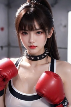 1girl, solo, wet,long hair, looking at viewer, bangs, sweat,brown hair, black hair, closed mouth, upper body, ponytail, spiked collar,spikes, blurry, black eyes, lips, black choker, top, realistic, red lips, red boxing gloves