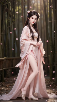In the depths of a tranquil bamboo forest, a graceful maiden stands elegantly at the center of the scene in a side pose. Her long hair cascades like ink, adorned with tiny pink petals, as if merging with nature. She wears a pink Hanfu, featuring exquisite embroidery, adorned with bamboo leaves and plum blossom patterns, showcasing a rich sense of Chinese traditional style. The long dress flows gently with her movements, as if the gentle breeze brushes past, bringing a touch of freshness. Beneath the short skirt, she wears embroidered shoes, the surface adorned with intricate bamboo knot patterns, adding an aura of classical elegance to her ensemble.