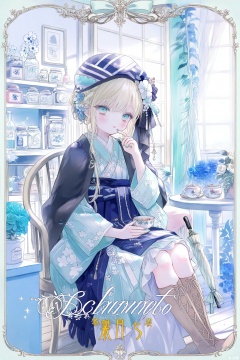 loli, 1girl, flower, japanese clothes, kimono, sash, solo, umbrella, cross-laced footwear, blue flower, cup, gloves, obi, boots, chair, sitting, blue kimono, hair ornament, black gloves, lace-up boots, hair flower, looking at viewer, chest of drawers, blue rose, holding, jar, blue nails, hat, vase, white flower, aqua kimono, blue eyes, sidelocks, window, white rose, hair bun, wooden floor, nail polish, striped headwear, single hair bun, rose, single glove, wide sleeves, braid, holding cup, indoors, long hair, box, striped clothes, long sleeves, blue headwear, yellow nails, frills, closed umbrella, border, knee boots, black footwear, lace trim, unworn gloves, refrigerator, brown footwear, grey hair, shawl, potted plant, braided bun, lace-trimmed gloves, lace-trimmed sleeves, on chair, aqua eyes, aqua theme, aqua nails, teapot, frilled kimono, cabinet, drawer, bottle, bouquet, shelf, feet out of frame, blush, blue border, makeup, furisode, brown gloves, jewelry, vertical-striped clothes, lace gloves, lace, blonde hair, white sash, flower pot, plant, capelet, lipstick, teacup, english text, white umbrella, inset border, character name, table, parted lips, finger to mouth, curtains, french braid