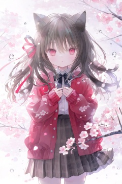loli, 1girl, solo, animal ears, red eyes, ribbon, cat ears, skirt, shirt, black hair, white shirt, long hair, red jacket, looking at viewer, red ribbon, pink flower, hair ribbon, cherry blossoms, parted lips, open clothes, collared shirt, long sleeves, plaid skirt, black ribbon, flower, black skirt, plaid, jacket, neck ribbon, shirt tucked in, hair between eyes, open jacket, black bow, red coat, water drop, sleeves past wrists, branch, blurry, black bowtie, standing, pleated skirt, sparkle, brown skirt, cowboy shot, red cardigan, bow, cat girl, straight-on, hands on own chest, cardigan, open cardigan, animal ear fluff, school uniform, upper body