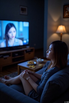 In the living room, she curls up on the sofa watching dramas, snacks scattered around, with the blue light of the TV screen flickering. Taken with Olympus OM-D E-M1X, 45mm lens, f/2.2, ISO 640, mixed lighting creates a lazy home movie atmosphere.,plns,tgh,