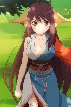 1girl, solo, long hair, breasts, looking at viewer, large breasts, red eyes, thighhighs, animal ears, cleavage, very long hair, purple hair, ahoge, japanese clothes, kimono, sash, antenna hair, single sleeve,masterpiece,best quality,official art,extremely detailed CG unity 8k wallpaper,,Thigh exposed,thighhighs,looking at viewer,in a meadow,