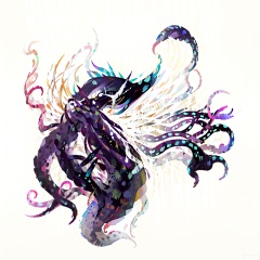 The image depicts a stylized, abstract representation of an octopus-like creature. It features a central body with eight tentacles, each varying in length and color from dark purple to black. The tentacles are arranged in a dynamic, flowing manner, giving the impression of movement or fluidity. The background is plain white, which makes the vivid colors and intricate details of the creature stand out prominently. The overall design is modern and artistic, with a focus on the organic form of the creature.monster,crystal,sdorica