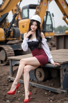 Realistic photo of a young woman with long hair, hard hat, fair skin, big breast, off-shoulder shirt, short pencil skirt, long legs, red high heels, full body, sitting, excavator, construction site,