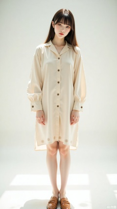 Photographed in the studio, beautiful photos, tall girls, delicate facial features, gentle and gentle low bun, light beige loose dress, exquisite embroidery on the cuffs and hem. Paired with flesh-colored pantyhose and light brown low-heeled loafers. In Japanese streets, exudes a gentle and healing atmosphere, straight and long legs, looking at the camera, standing, posing, full-body photo, pure white minimalist background, low angle upward shot, center composition, shallow depth of field, side backlight, contour light, ethereal light, light and shadow contrast, realistic style, clear skin texture, clothes wrinkles and hair details treatment, film grain, film aesthetics, light and shadow aesthetics, full atmosphere, high-end sense, 8K ultra-high definition, perfect quality, master-level works.