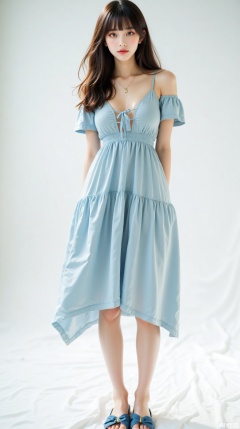 Photographed in the studio, beautiful photos, tall girls, delicate facial features, large wavy curly hair, casual and natural, light blue off-shoulder dress, irregular tailoring of the skirt. Bed with blue flat sandals. The sea breeze brings a romantic and comfortable feeling of seaside vacation, straight and long legs, looking at the camera, standing, posing, full-body photo, pure white minimalist background, low angle upward shot, center composition, shallow depth of field, side backlight, contour light, ethereal light, light and shadow contrast, realistic style, clear skin texture, clothes wrinkles and hair details processing, film grain, film aesthetics, light and shadow aesthetics, full atmosphere, high-end sense, 8K ultra-high definition, perfect quality, master-level works.