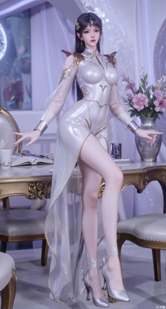Ultra clear, wallpaper, 8k, masterpiece, 1girl, solo, long hair, breasts, looking at viewer, bangs, large breasts,long dress,, bare shoulders, jewelry, black hair, standing, purple eyes, full body, flower, thighs, indoors, hair bun, long dress, high heels, cup, see-through, book, bare legs, window, table, white footwear, standing on one leg, curtains, pink flower, side slit, vase, ,(huge breasts:2.99),(full breasts:2.99),phone screen,XanmiaoyiY,XhuolingerHHY,XwangqiuerKQW,Xxuenv,Xnanqiuqiu,Xhuangnv,XchuxuanerX,XchuxuanerXY,Xjuzi,XyunyunX,XqingnvzongZM,XanmiaoyiXY,Xqianrenxue,Xaichen,c-hd,Xhuanlingwang