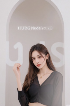 Photograph of an beautiful woman with long, straight, dark brown hair, wearing a sheer black crop top with a cross necklace. She has a dark complexion, full lips, and a neutral expression. The background is a plain white wall with an arch, with large white  text "HUBG NudeFlux" and numbers "3.0" in the background. The image has a soft, dreamy quality with natural lighting.