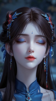 , minimalism, surrealism, national style, advanced, color contrast, grotesque aesthetics, Chinese aesthetics, melancholy, sense of atmosphere, rhapsody in the universe, half-length close-up, portrait is blue, with blue hairpin, blue mixed with black, blue is the light, light and atmosphere born in the dark,1girl,,huolinger,hle,eyes closed,eyeshadow,forehead tattoo,Exquisite face makeup,Exotic customs,