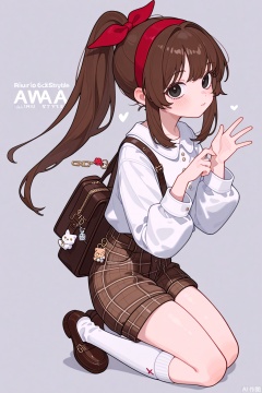 ruirui, 1girl,brown hair,shorts,brown footwear,white shirt,long hair, black eyes,white kneehighs socks,ponytail,red hairband,