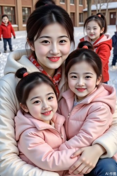 Real photography of a person with big eyes, double eyelids, fair skin, ponytail, a 25-year-old girl and two little girls taking pictures outdoors, sitting in the snow. The beauty is holding the little girl, and in the background, children can be seen playing in the snow in what appears to be a park or playground. The beauty is wearing a white down jacket and a red and white scarf, and the little girl is wearing a pink down jacket, scarf and braids. They all smiled and looked warm and happy.