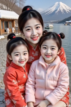 Real photography of a person with big eyes, double eyelids, fair skin, ponytail, a 25-year-old girl and a little girl taking pictures outdoors, sitting in the snow. The background is a small village by the river, with a bluestone path on the shore, a fishing boat on the water in the distance, and a mountain peak in the distance. The top of the mountain is covered with snow.whole body