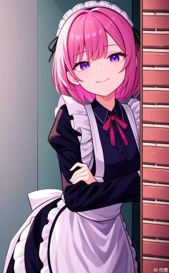 masterpiece,best quality,amazing quality, CivChan, purple eyes, pink hair, peeking out, wall, looking at viewer, maid, smirk,medium hair,